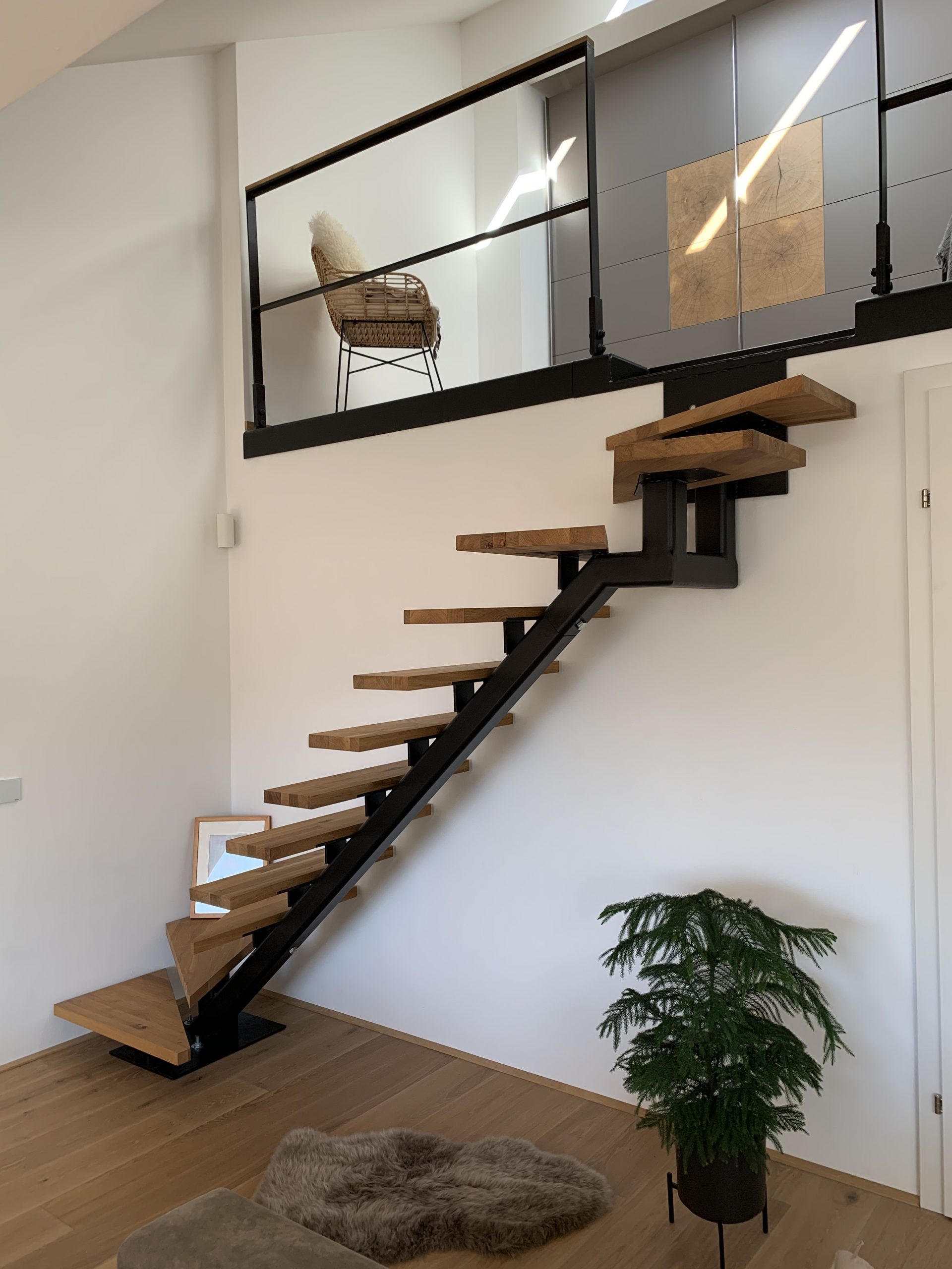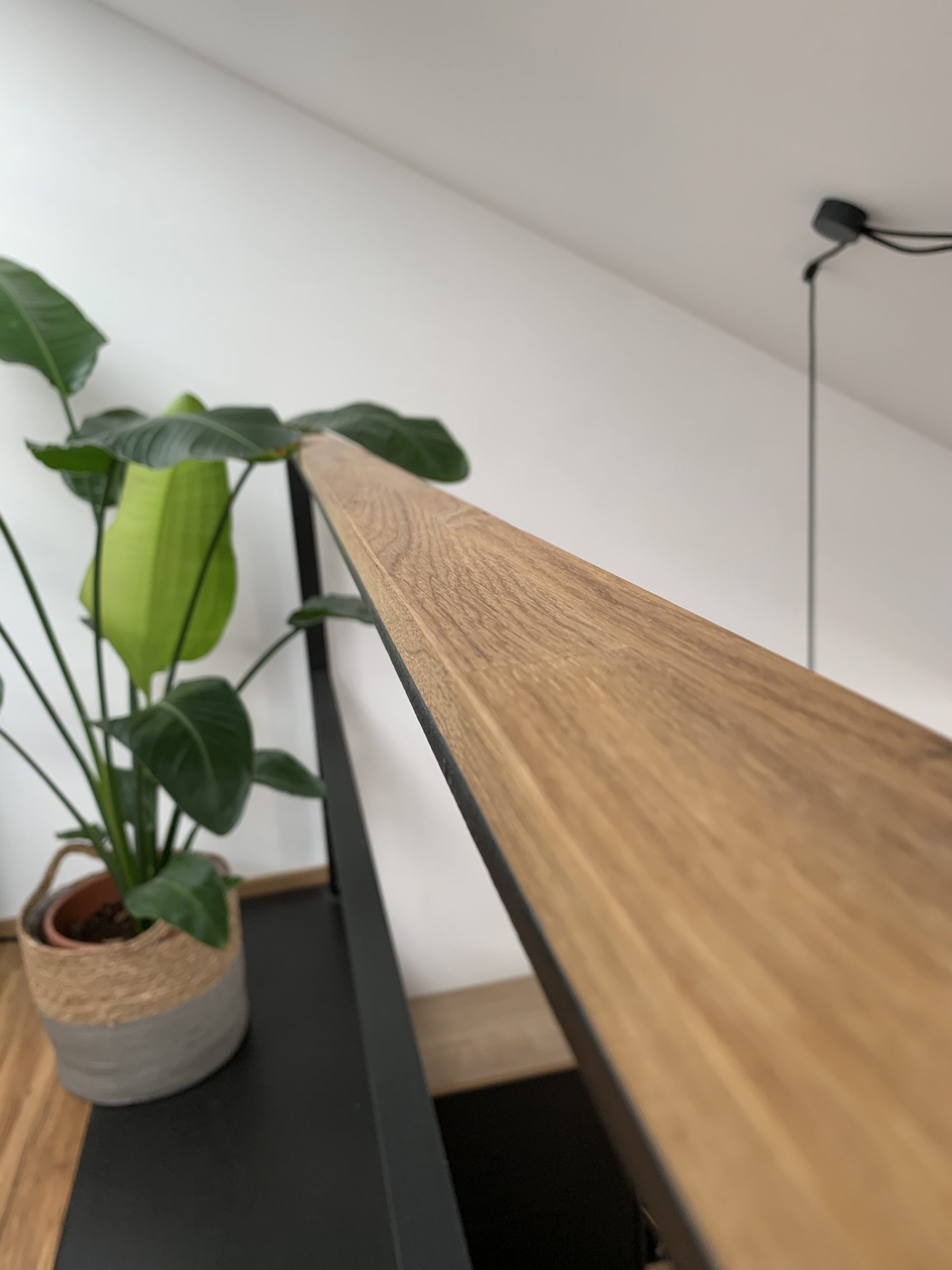 Hohe Stabilität durch eine feine Stahlkonstruktion und trotzdem ein wohliges Gefühl durch den weichen Handlauf aus Eiche.