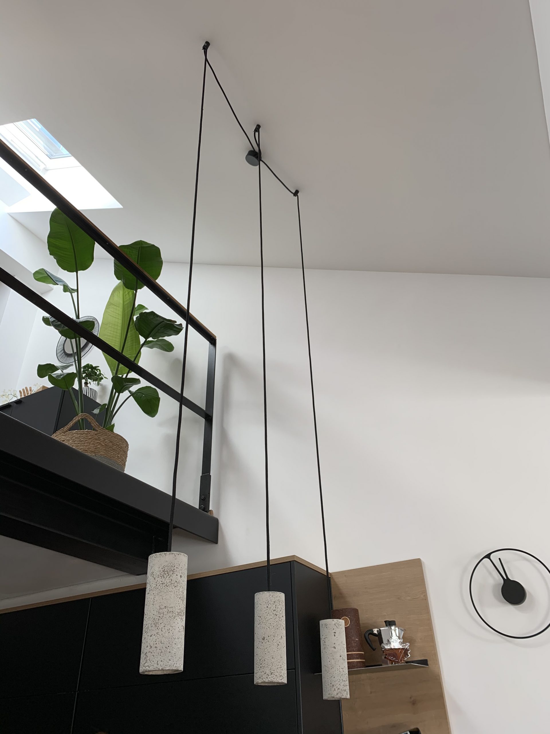 Diese drei Betonlampen verwenden Energiesparende LED Spots. Das Kabel ist mit einem weichen Stoff ummantelt und bietet so einen tollen Kontrast zum harten Beton.